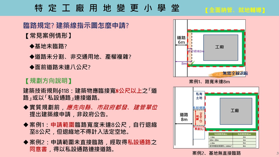 - 防汛道路(如河邊便道):原則上是不能用來當作指定建築線的,建議重新規劃廠區的其他連外道路。